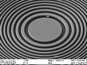 Also FZP lens functionality relies absolutely on the total pattern precision across the full write field (100x100microns). In this case this had to be accurate down to <5 nanometers (beyond the deflection precision and stability of a conventional microscope). The additional requirements of using a small Gallium beam size with a ‘low tails’ profile, combined with constant beam ‘circularity’ under high deflection, and current stability over long periods are also of particular note. (These were only achievable by removing the suppressor element from the source assembly and using a novel control method for maintaining beam current over long periods).
